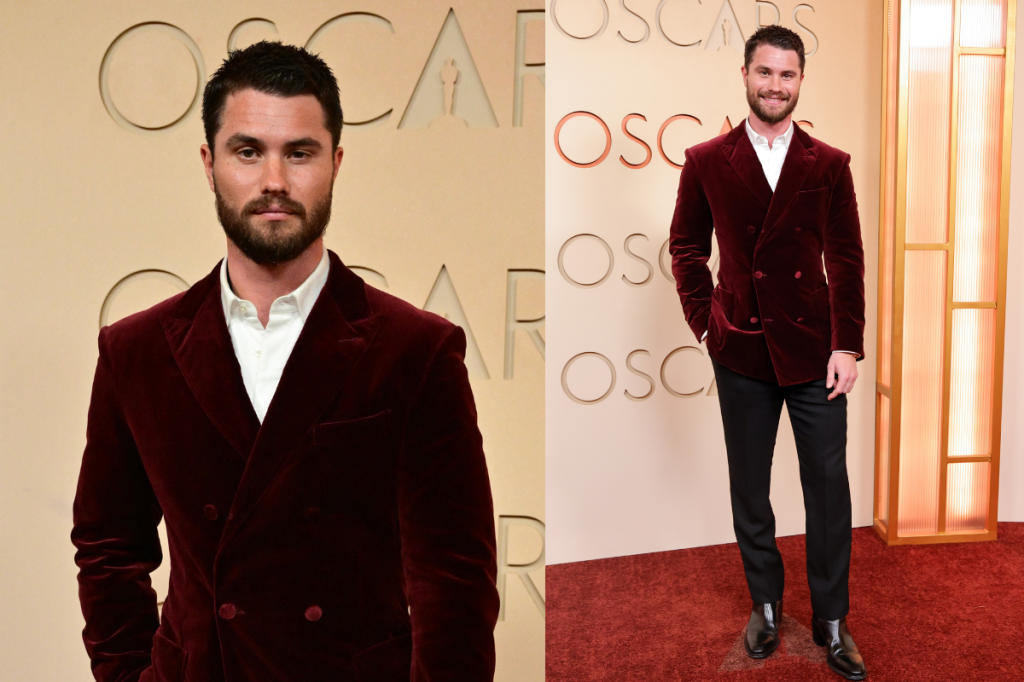 The Outer Banks star was spotted wearing a burgundy suit with a white button shirt and black dress shoes as he made his way down the red carpet of the Dolby Theatre.