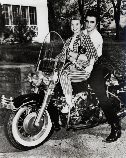 LOS ANGELES – CIRCA 1956: Rock and roll singer Elvis Presley with his arms around actress Yvonne Lime on the back of a motorcycle while filming the movie “Loving You” in circa 1956 in Los Angeles, California. (Photo by Michael Ochs Archives/Getty Images)
