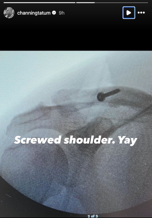 “Screwed shoulder,” Tatum wrote over the medical imaging showing his newly-repaired joint. “Yay.”