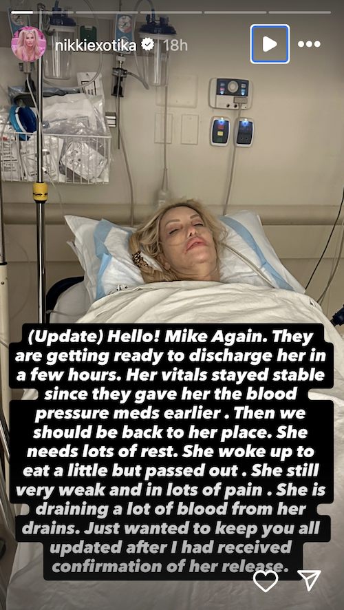 Sharing a photo of Nikki in a hospital bed, the friend wrote, “Nicole had a very complicated surgery today and had excessive bleeding. She’s in recovery now but very weak, she refused a blood transfusion prior to surgery. They are monitoring her overnight at the hospital. I will be taking care of her, I’ll be giving more updates on her progress as time passes.”