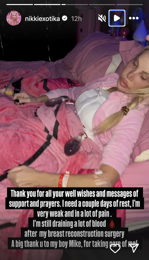 Later that day, Nikki shared a message of her own on her Story, thanking everyone for their “messages of support and prayers.” She explained, “I need a couple days of rest, I’m very weak and in a lot of pain. I’m still draining a lot of blood after my breast reconstruction surgery.”