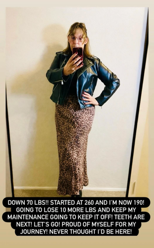 The TLC personality, 55, took to her Instagram Story on Saturday to celebrate her weight loss journey, writing over a photo of herself, “Started at 260 and I’m now 190!” She continued, “Going to lose 10 more lbs and keep my maintenance going to keep it off! Teeth are next! Let’s go! Proud of myself for my journey. Never thought I’d be here!”