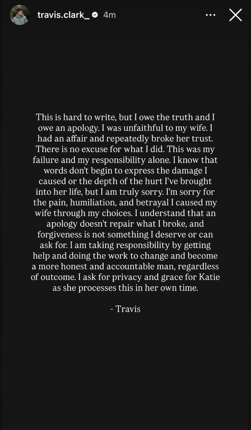 Apologizing for the “pain, humiliation, and betrayal I caused my wife through my choices,” Clark continued, “I understand that an apology doesnโt repair what I broke, and forgiveness is not something I deserve or can ask for.”