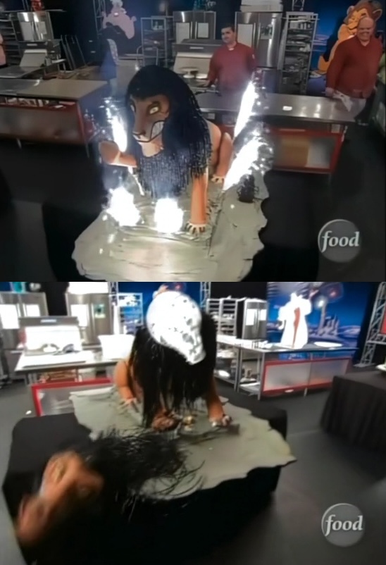 Instead of a more reasonable choice, the Food Network Challenge competitor chose black licorice for Scarr’s mane. For those who haven’t used black licorice to bake, “that s—’s f—ing heavy,” she explained. It weighed down the head and ultimately led to the cake-Scar’s decapitation.