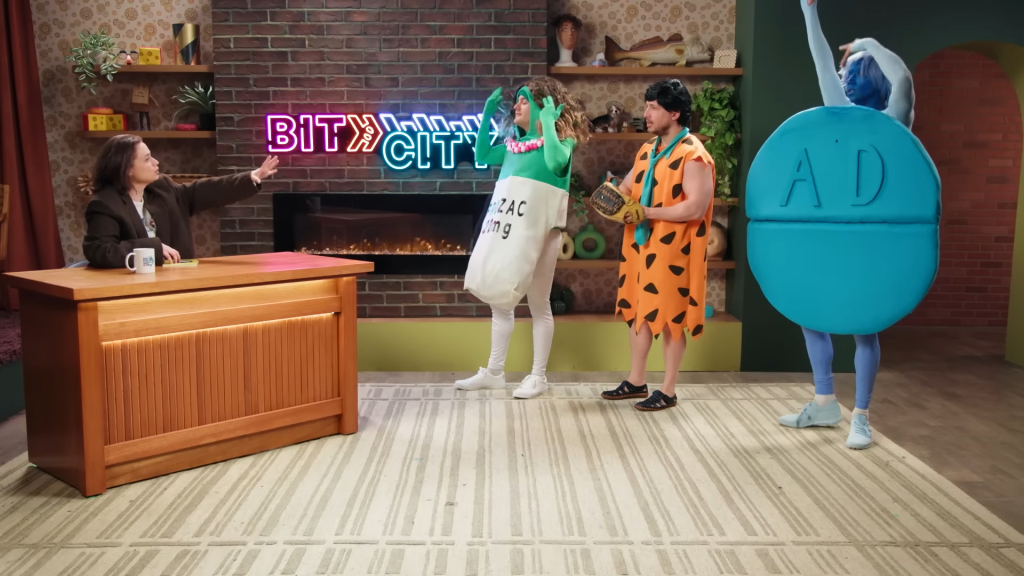 Bit City, hosted by Smosh troupe member Angela Giarratana, sees the Smosh cast and special guests act in sketches and other unscripted segments. Episodes feature wild themes and concepts, such as an installment where the cast has to produce and film an entire video without their crew and an episode where the cast has to solve a series of escape rooms while in-character.