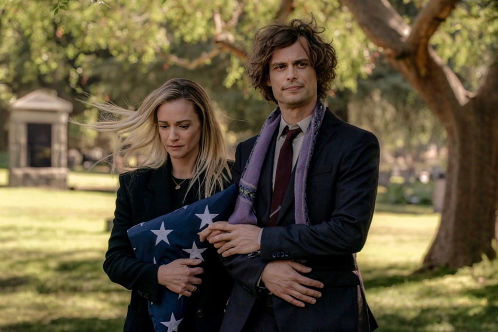 The episode saw the aftermath of the death of JJ’s husband, Will (Josh Stewart). He had an aneurysm in the previous episode, with JJ telling the team that he died in the final seconds of the episode. After dealing with her mother and mother-in-law, JJ was keeping it together for her sons, played by Cook’s real-life sons, at the funeral. After the oldest son, ,Henry, told his mom, “I told you he’d come,” Reid walks through the door, hugging his friend and godsons before reuniting with the rest of the BAU before the funeral starts.