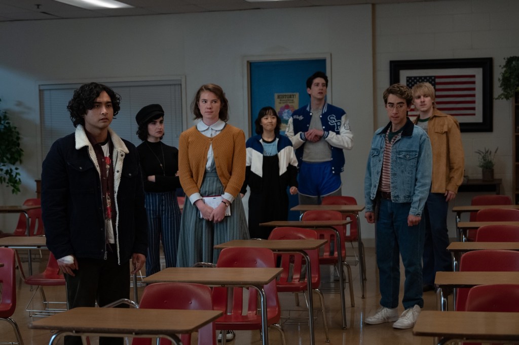 L-R: Kristian Ventura as Simon Elroy, Sarah Yarkin as Rhonda, Jess Gabor as Janet Hamilton, Ci Hang Ma as Quinn, Milo Manheim as Wally Clark, Nick Pugliese as Charley and Miles Elliot as Yuri in School Spirits, Season 3, streaming on Paramount+, 2026. Photo Credit: Ed Araquel/Paramount+