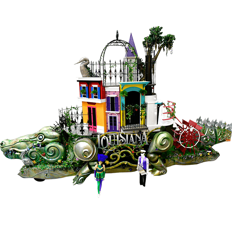 The Celebration Gator is the longest parade float ever at 60 feet from nose to tail. The Louisiana Office of Tourism sponsored the Celebration Gator float as a tribute to Louisiana’s rich culture. The float features azaleas, magnolias, and, of course, mardi gras beads. If you are able to look through the logo, you can see the animators working the float.