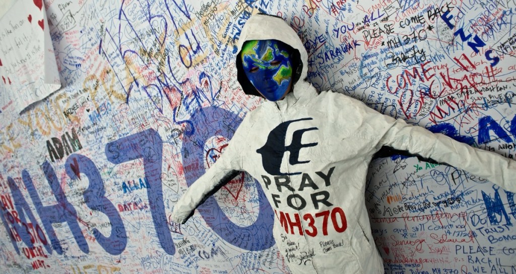 A performer poses in front of messages expressing prayers and well-wishes for passengers onboard missing Malaysia Airlines (MAS) flight MH370 at Kuala Lumpur International Airport in Sepang on March 17, 2014. An investigation into the pilots of missing Malaysia Airlines flight 370 intensified on March 17 after officials confirmed that the last words spoken from the cockpit came after a key signalling system was manually disabled. AFP PHOTO/ MANAN VATSYAYANA (Photo by Manan VATSYAYANA / AFP)