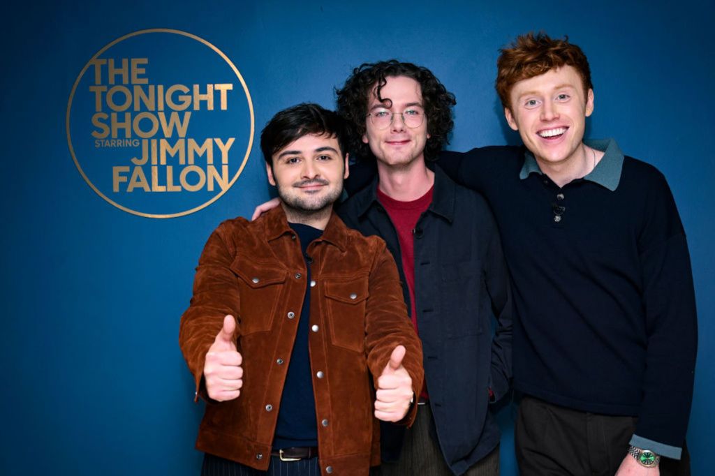 John Higgins, Martin Herlihy, and Ben Marshall of comedy trio Please Don’t Destroy pose together backstage on Monday, November 6, 2023. (Photo by: Todd Owyoung/NBC via Getty Images)